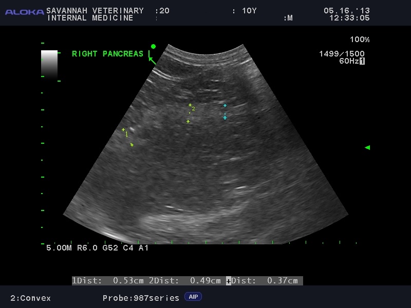 Blood Work: In cat’s, blood amylase and lipase levels are not reliable for diagnosing pancreatitis. Instead, a specialized blood test called a feline pancreatic lipase immunoreactivity (fPLI) assay — which provides rapid results through the in-house testing available at Savannah Veterinary Internal Medicine — has become the standard. The fPLI test measures lipase enzyme produced by the pancreas, and a high result is an indicator of pancreatitis. It is important to remember that the inflammation of chronic pancreatitis in cats can wax and wane. Therefore, a normal fPLI result does not always rule out the disease, particularly in cats with a history of chronic symptoms.