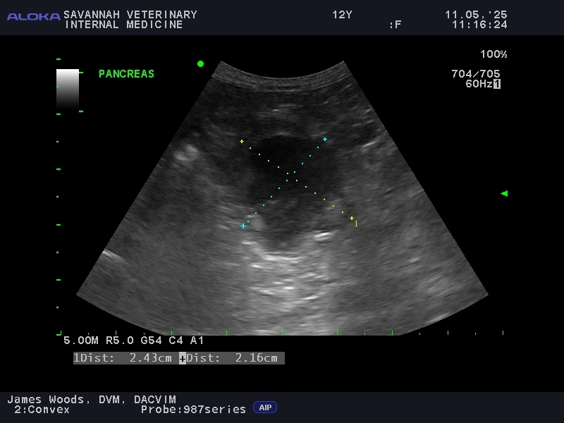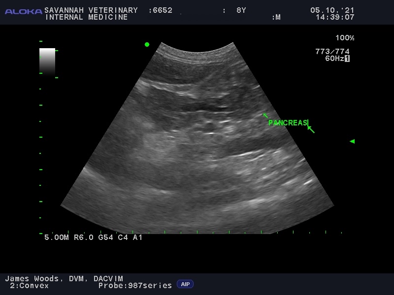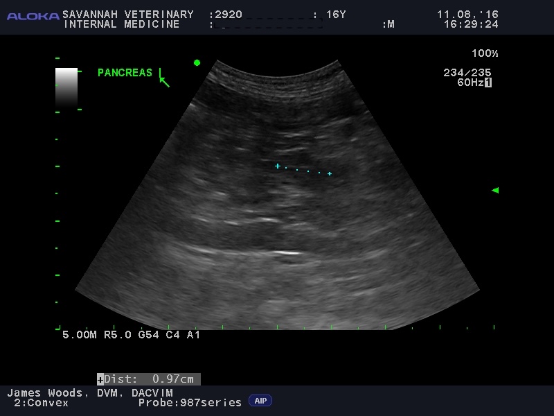 Visualizing The Pancreas: For the diagnosis of feline pancreatitis, an abdominal ultrasound is an important diagnostic tool. While X-rays are typically not very useful, ultrasound provides a non-invasive way to visualize the pancreas. The accuracy of ultrasound is highly dependent on the skill of the operator, as the pancreas can be difficult to locate and assess in cats. At Savannah Veterinary Internal Medicine, our team performs detailed ultrasounds to help identify pancreatitis, even in subtle cases. Even more so than the fPLI test, ultrasound may be normal in cats with mild, or chronic pancreatitis.